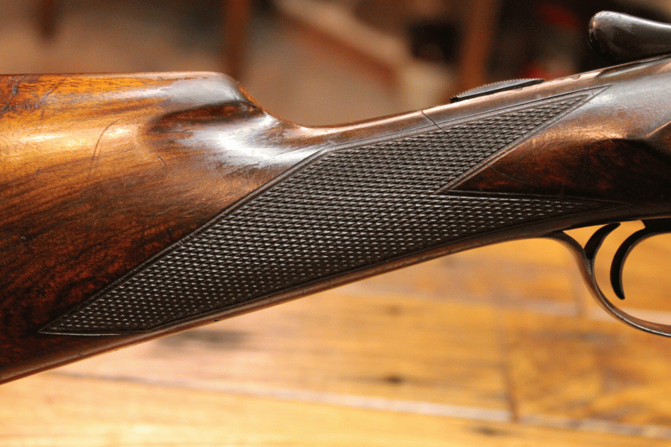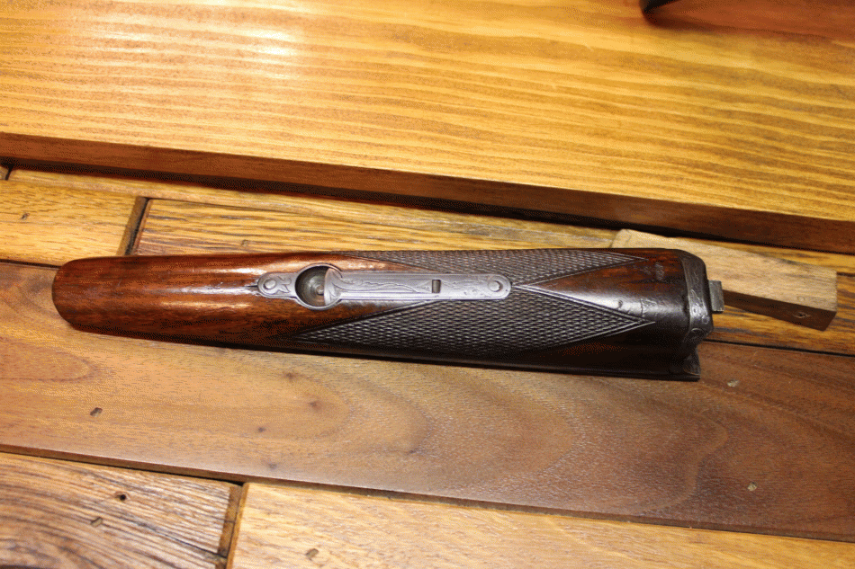 Offered is a rare Fox shotgun in restorable condition. It is a late style BE with 28" Barrels and English stock. The shotgun is in its orignal configuration. LOP is 14" DAH 3 1/4" DAC 1 3/4" chokes are MOD & Full. Mechanically the shotgun locks up tight and the ejectors are strong. original butt plate. Bores are shiney. There is a small solder repair to the bottom rib about 1" back from the muzzle. The stock is solid but there is a crack at the wrist that needs to be repaired . Action has been blued over and the barrels had some surface rust that was blued over. This shotgun could be brought back to its former glory if given the proper attention. This one is a rare one and twice as rare with the English stock.