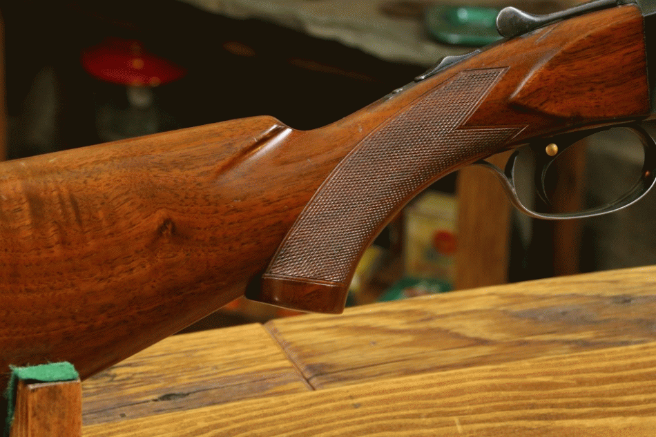 Winchester Model 21 Double. Seria Number 12245. This fine original Model 21 is in a very cool configuration of 26 inch 12 gauge factory choked WS-1 and WS-2 with a SPLINTER fore end, single trigger and ejectors. The blue is all original and Not restored with well over 90% remaining. There is some blue wear to the trigger plate and guard and few very light areas of loss on the barrels. The stock is excellent with length of pull of 14 inches over the orignal Winchester butt plate. There is a small piece of wood missing from the very tip of the fore end The bore are excellent and lock up is tight. Mid bead with red skeet front sight. Drop at comb is 1 1/2 inches and drop at heel is 2 1/2 inches. Weight is 7 lbs 9 oz. This is a great original Model 21 Skeet configured double.