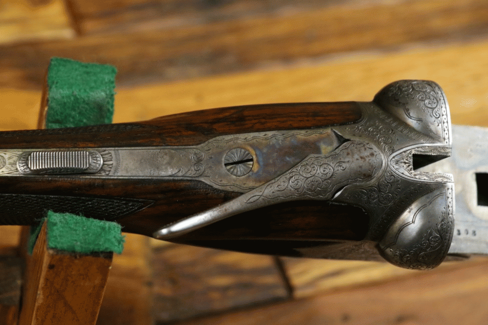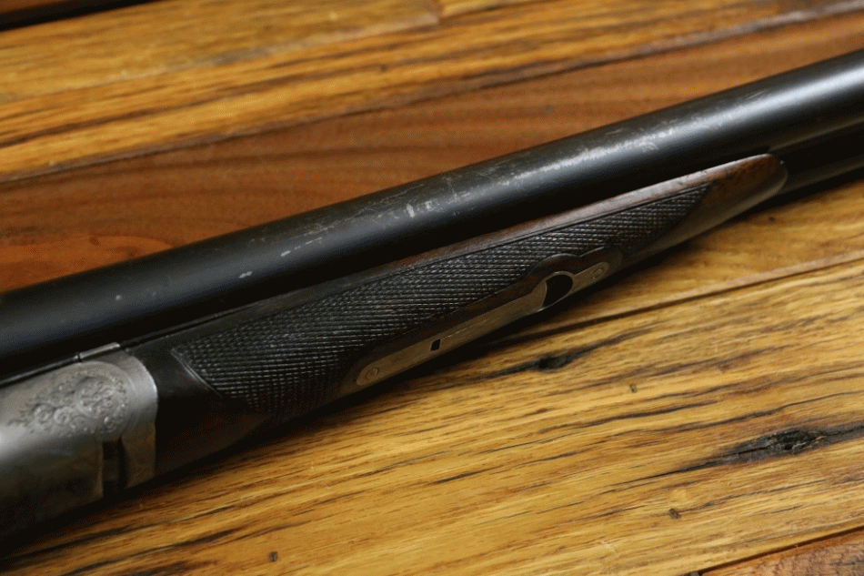 AH Fox late early CE grade 12 gauge. Serial number 21308 made circa 1914. Probably one of the last batch of Fox shotguns with Krupp barrels made just before the start of WW1. Superb condition with sharp C engraving and strong traces orf original case color. The engraving of the Setter on the underside of the action is much more detailed than you usually see on a C grade. Excellent original barrel blue on the 30 inch Krupp barrels with some common blue wear at the carry areas. Excellent shiny bores and the chokes are Full and Full. Chambers are 2 3/4 inches. Strong ejectors and tight lock up. Excellent original stock and fore end were lightly freshened a while ago. Great checkering with no repairs that we see. Original hard rubber butt plate and the length of pull is 14 inches from the front trigger. Dimensions are good; 1 1/2 drop at comb and 2 1/2 drop at heel. Weight is 8 lbs. This is just a fine old early CE Fox that is in collector condition.